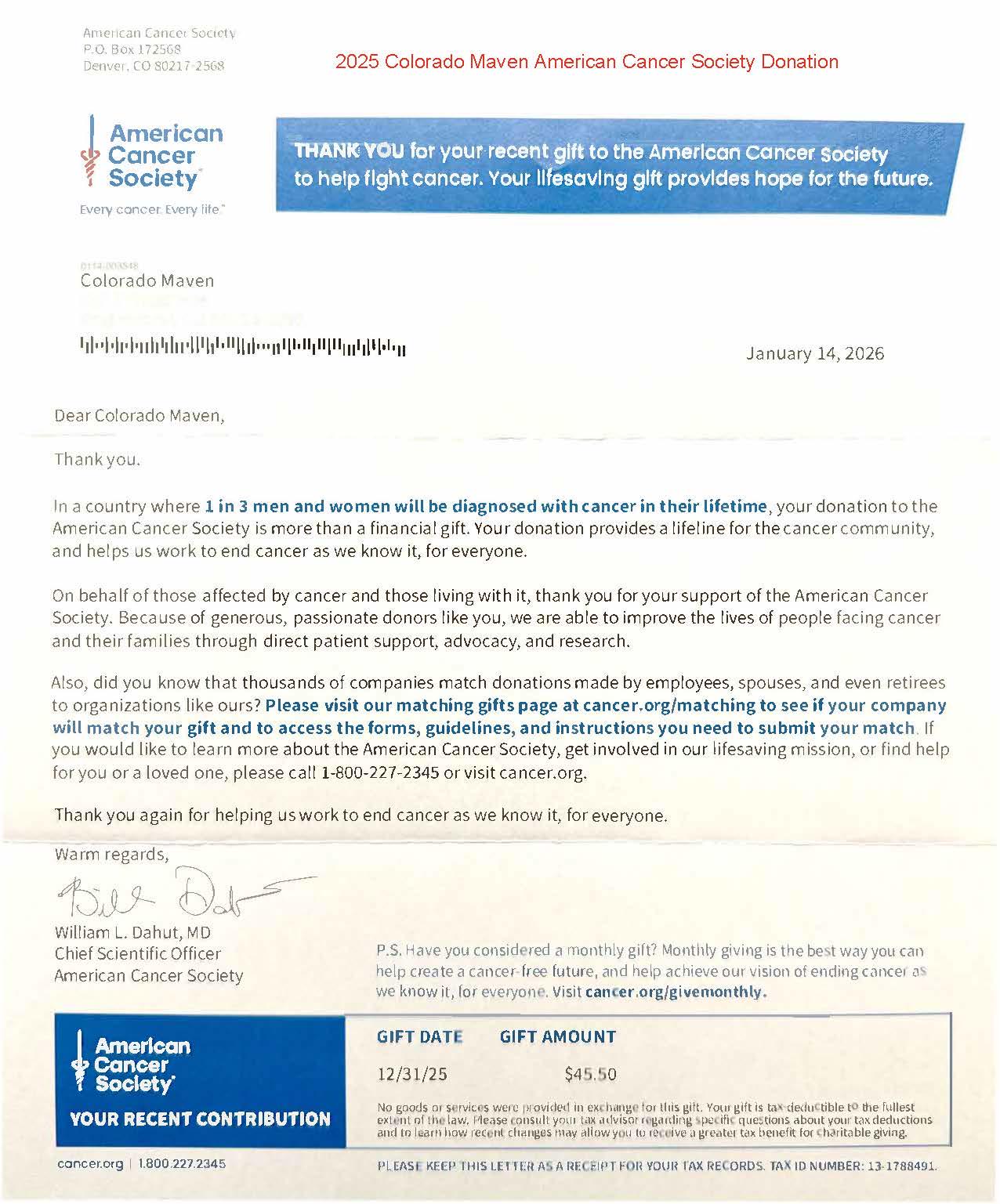 Note: A portion of the proceeds from each cancer band sold will be donated by Colorado Maven to benefit the American Cancer Society on an annual basis.