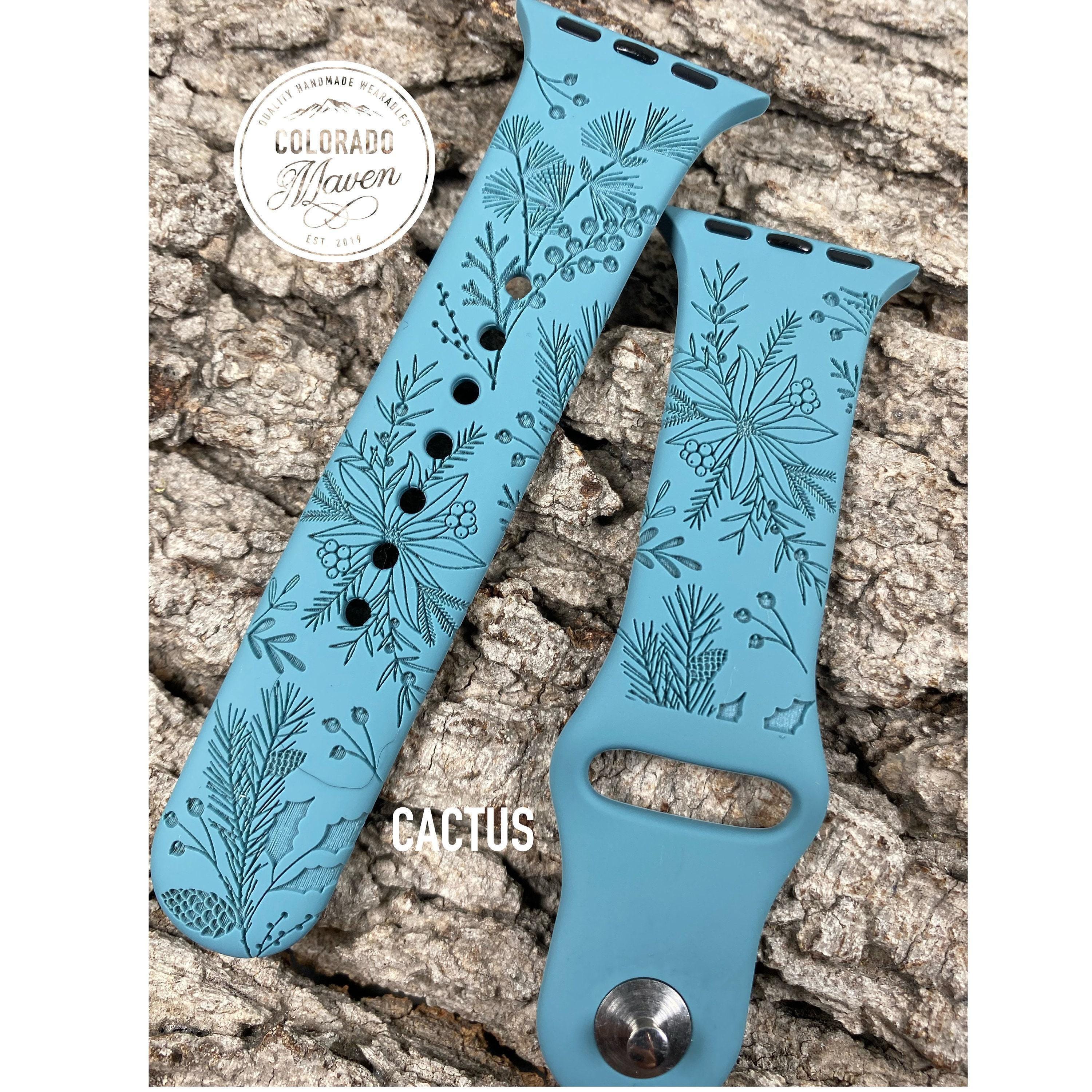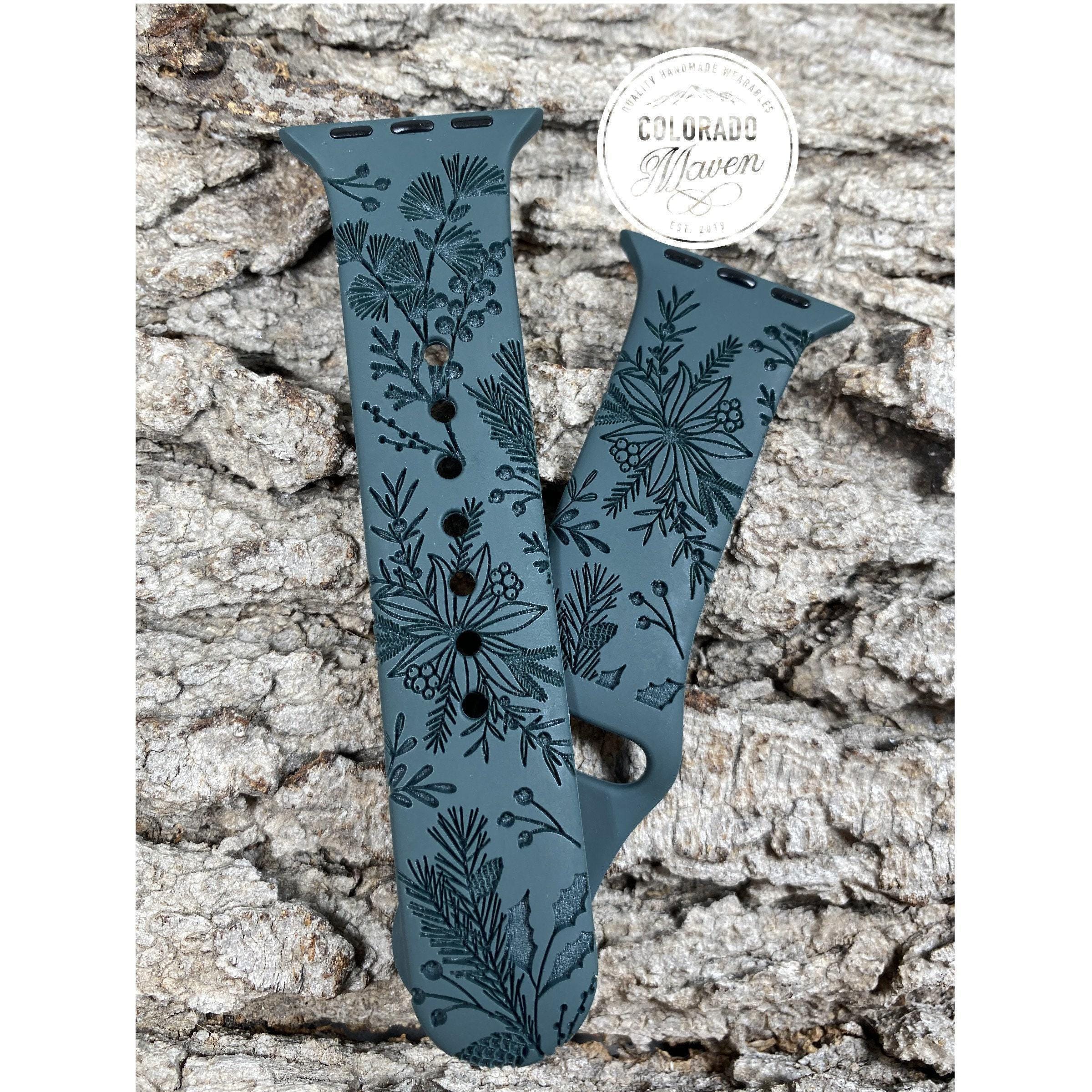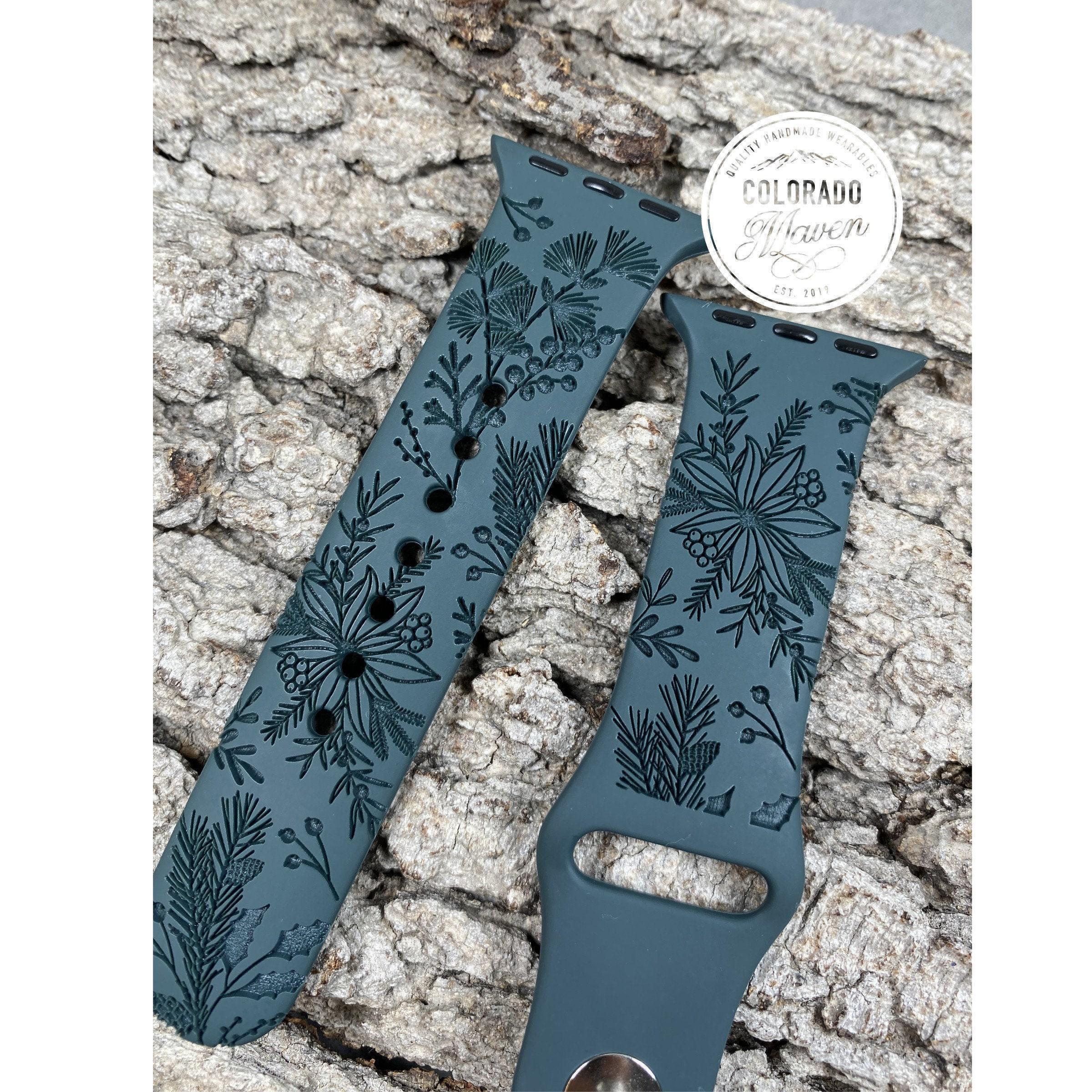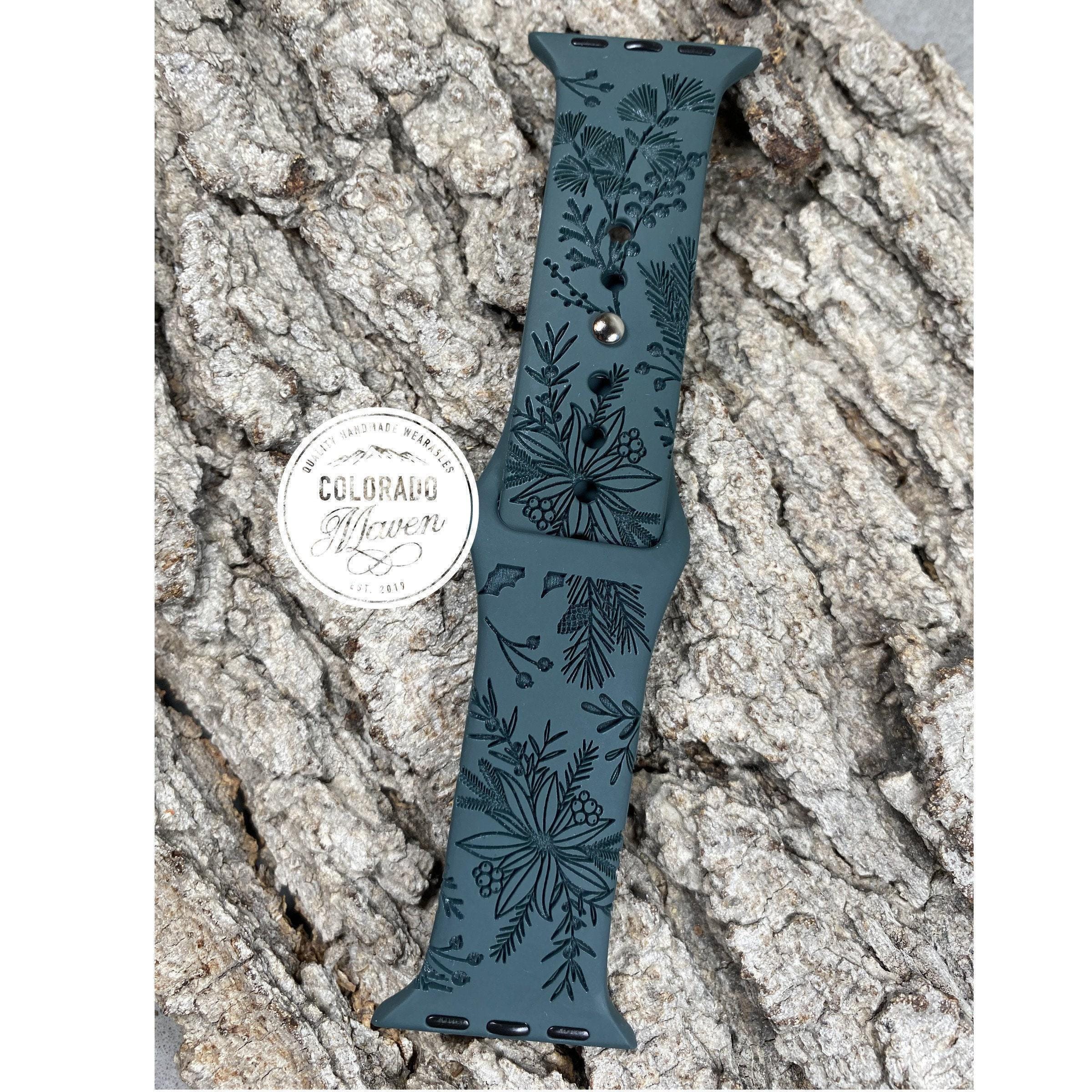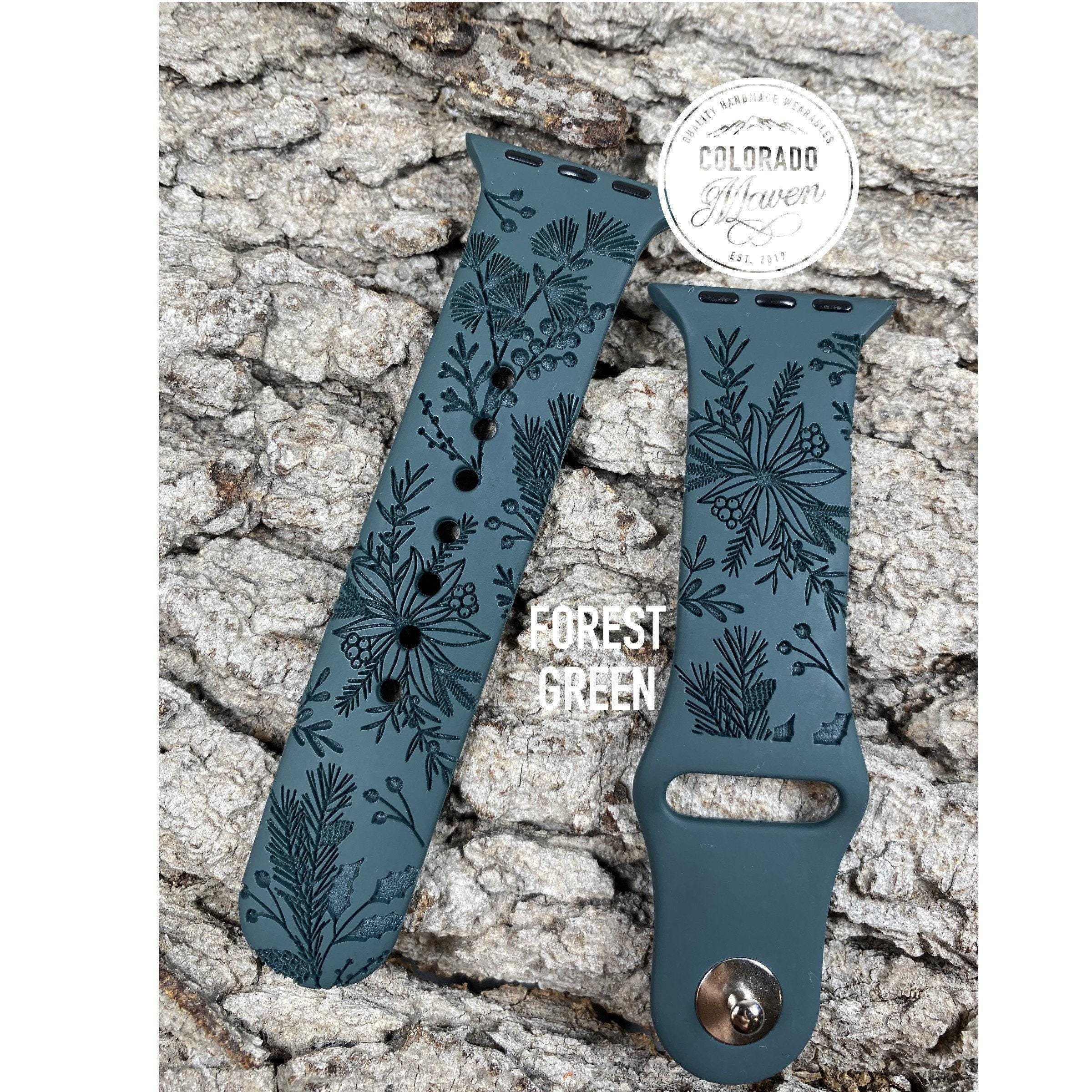 Winter Evergreen Poinsettia Silicone Watch Band Laser Engraved, Apple Watch Compatible Series 1-11, SE 1-3 & Ultra 1-3