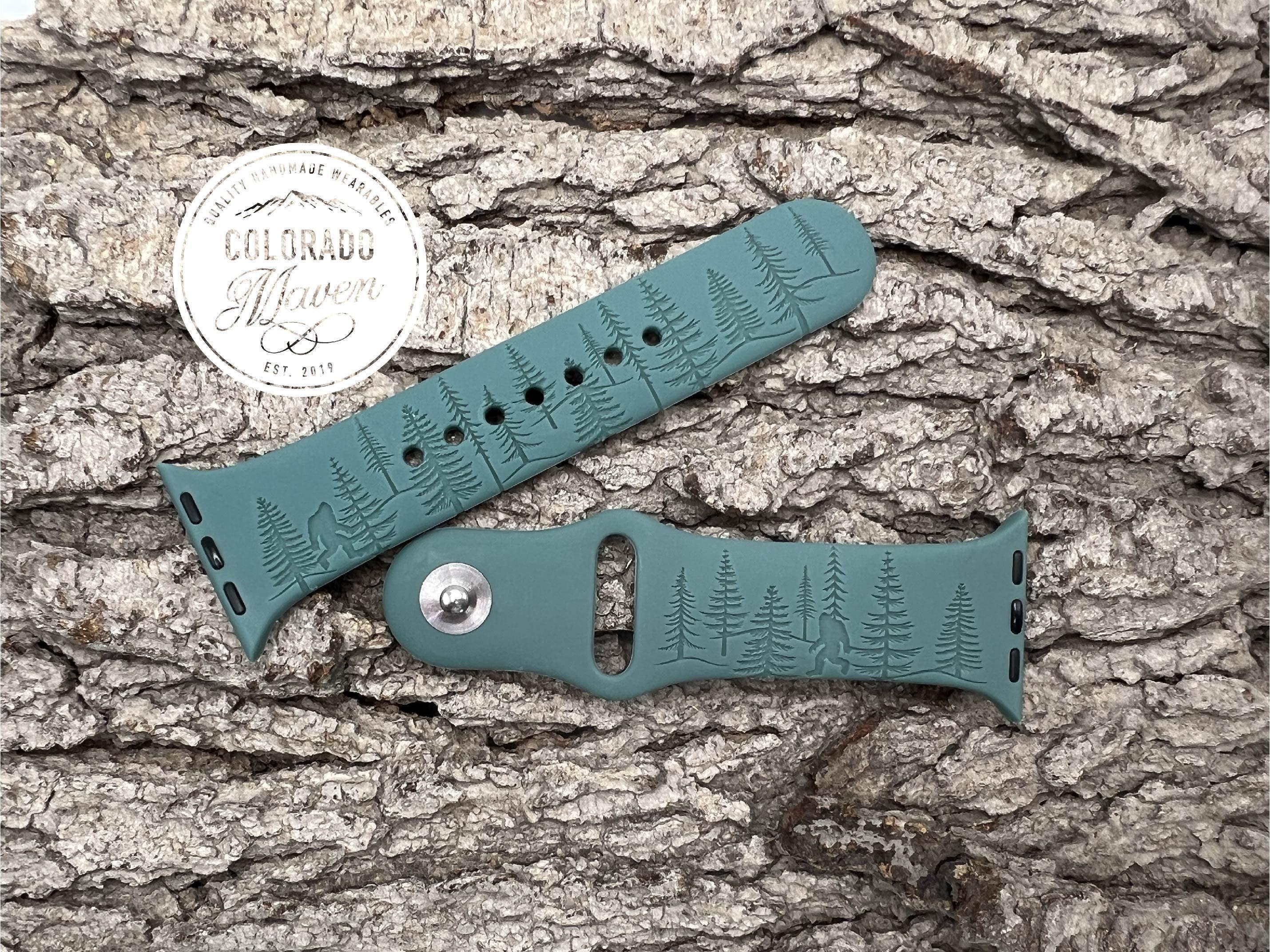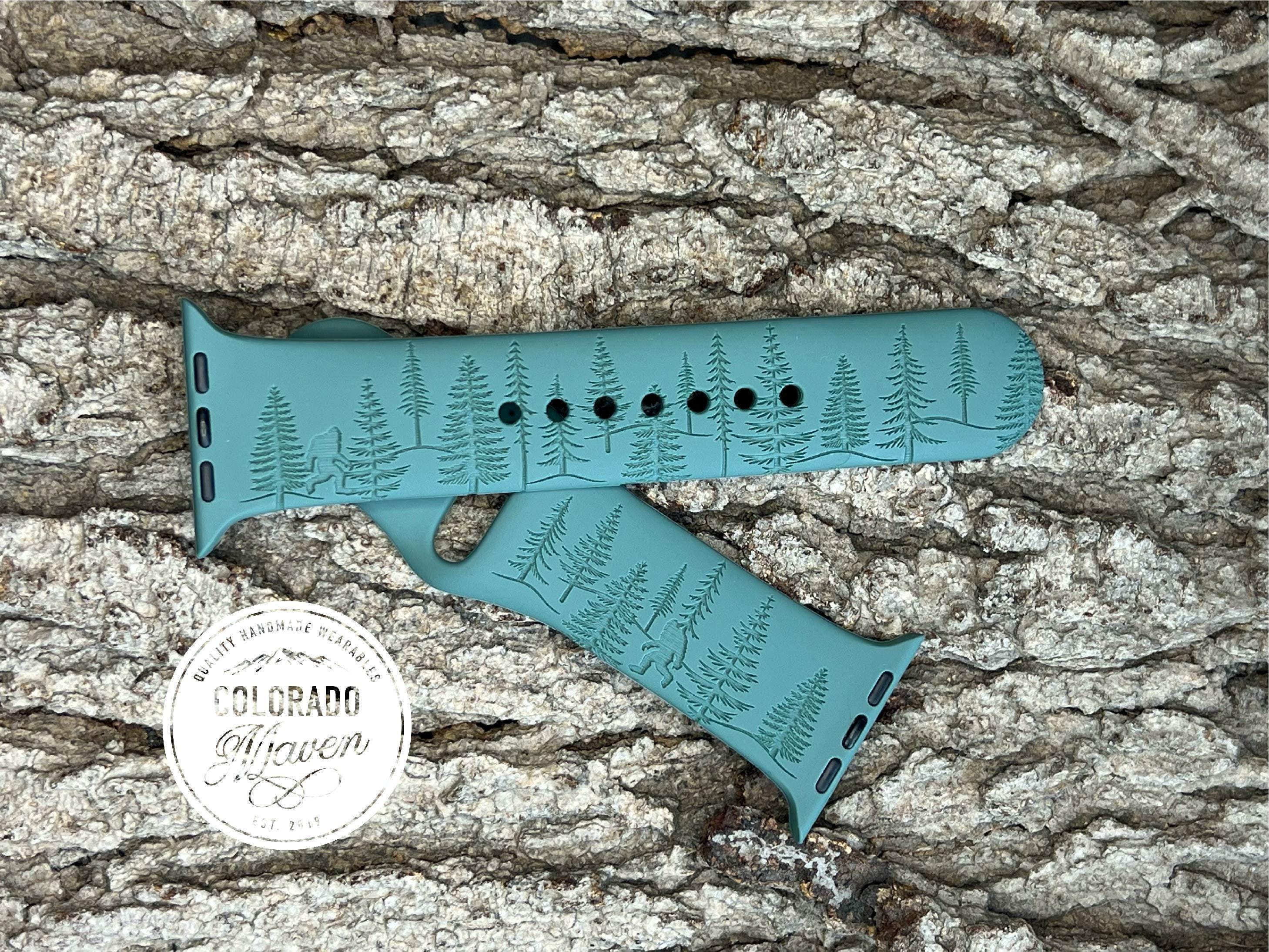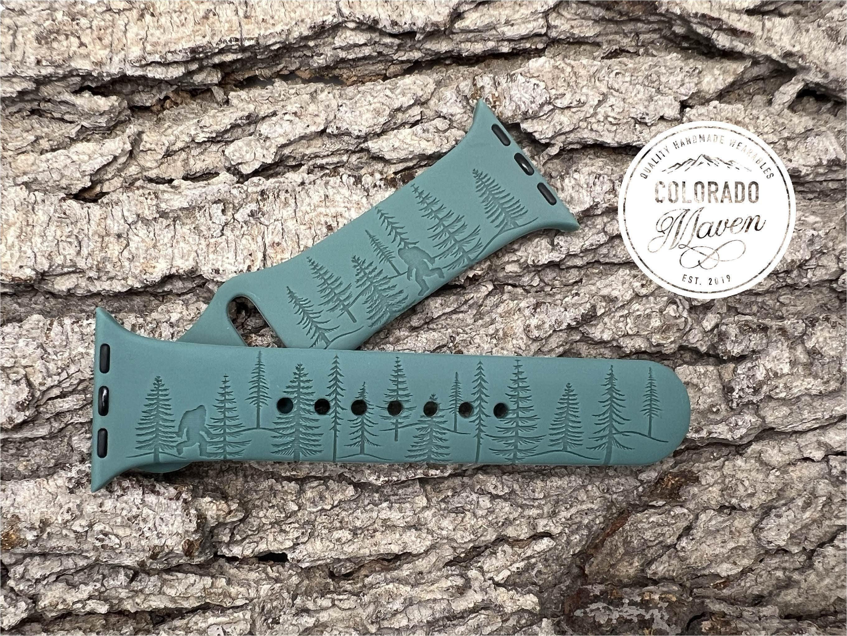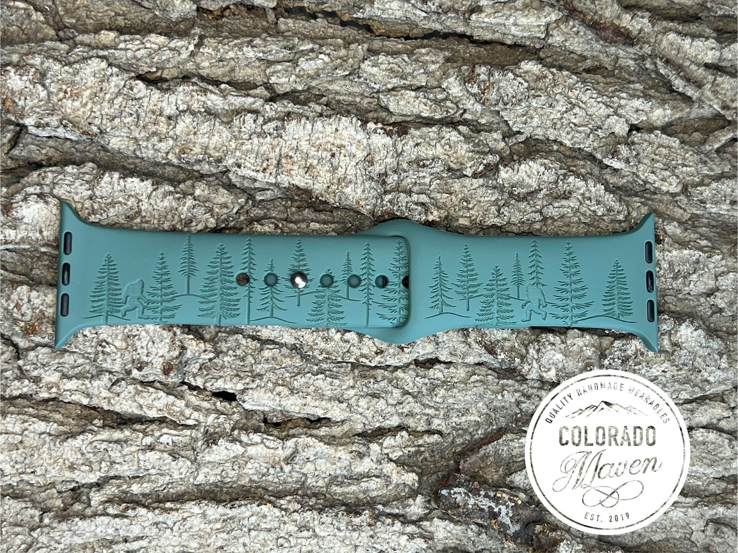 Bigfoot Sasquatch Forest Silicone Watch Band Laser Engraved, Apple Watch Compatible Series 1-11, SE 1-3 & Ultra 1-3