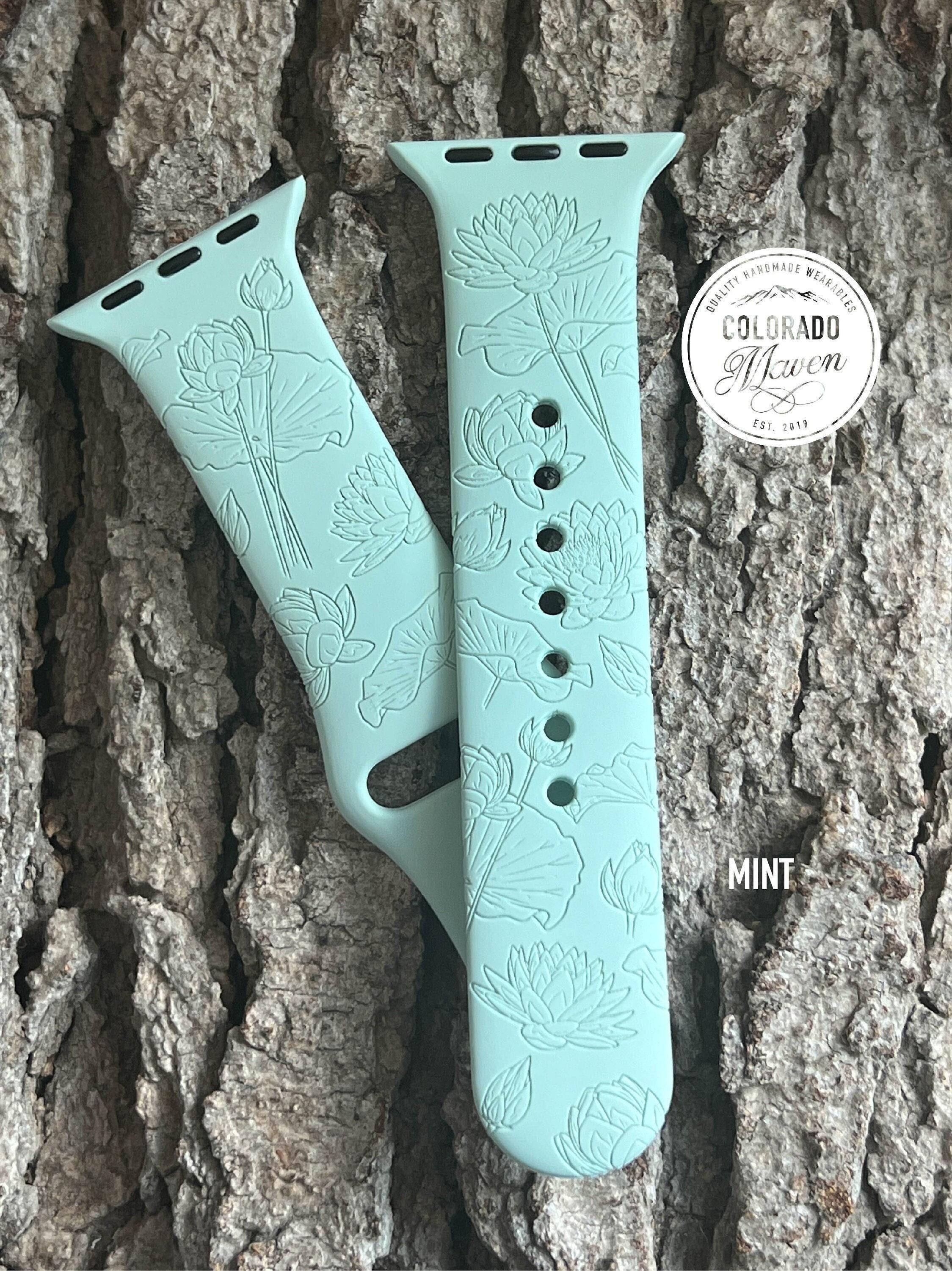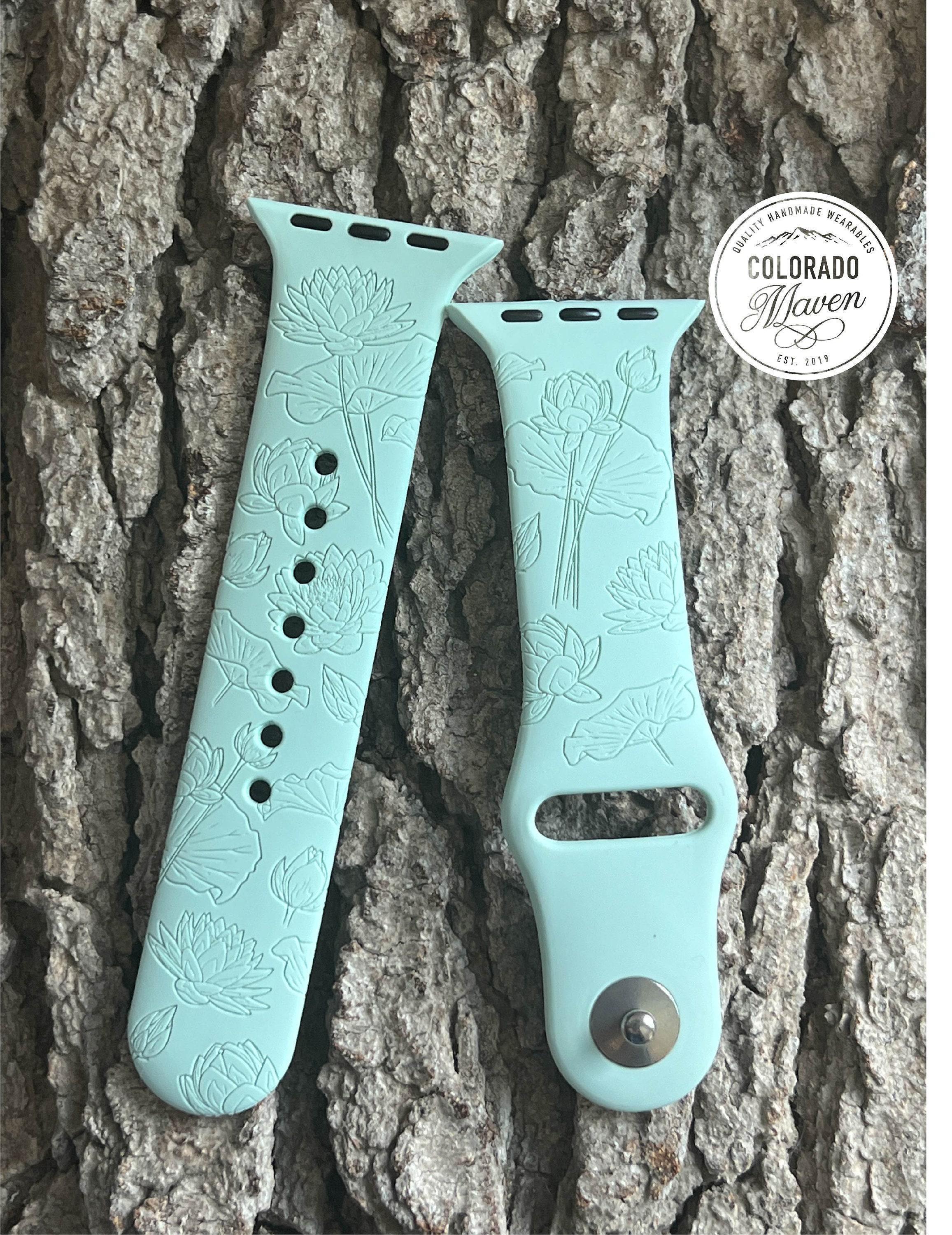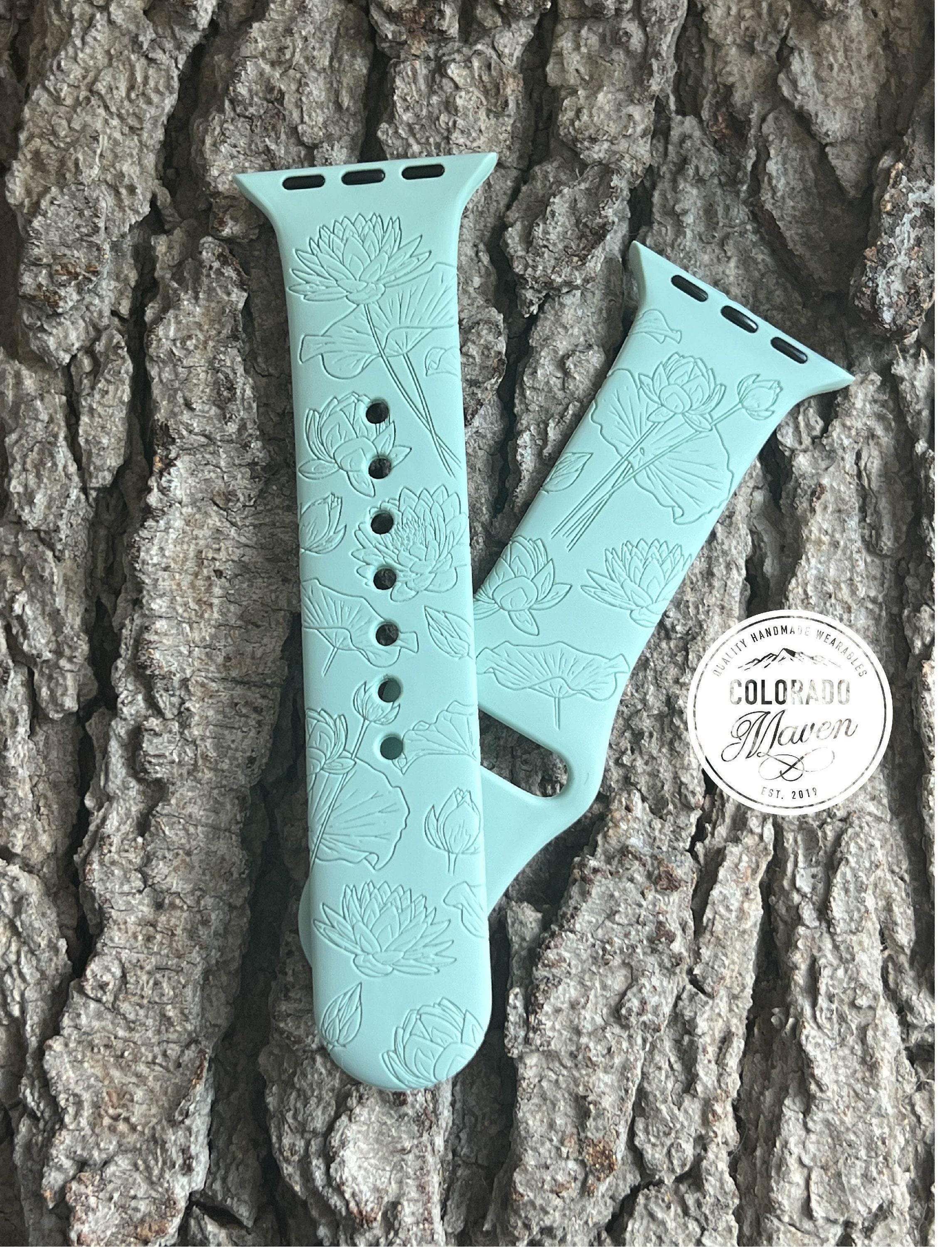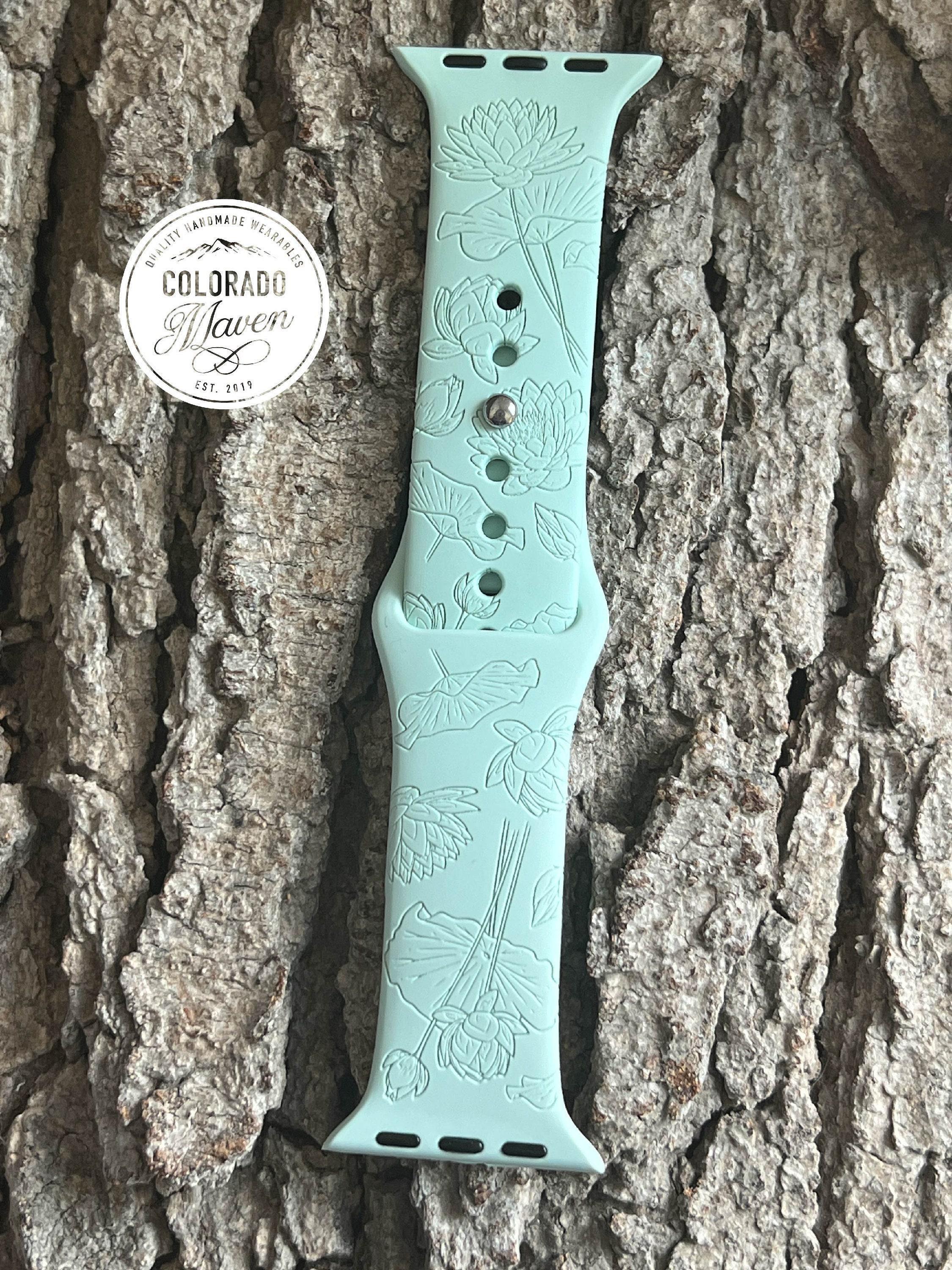 Lotus Flower Lily Pad Silicone Watch Band Laser Engraved, Apple Watch Compatible Series 1-11, SE 1-3 & Ultra 1-3